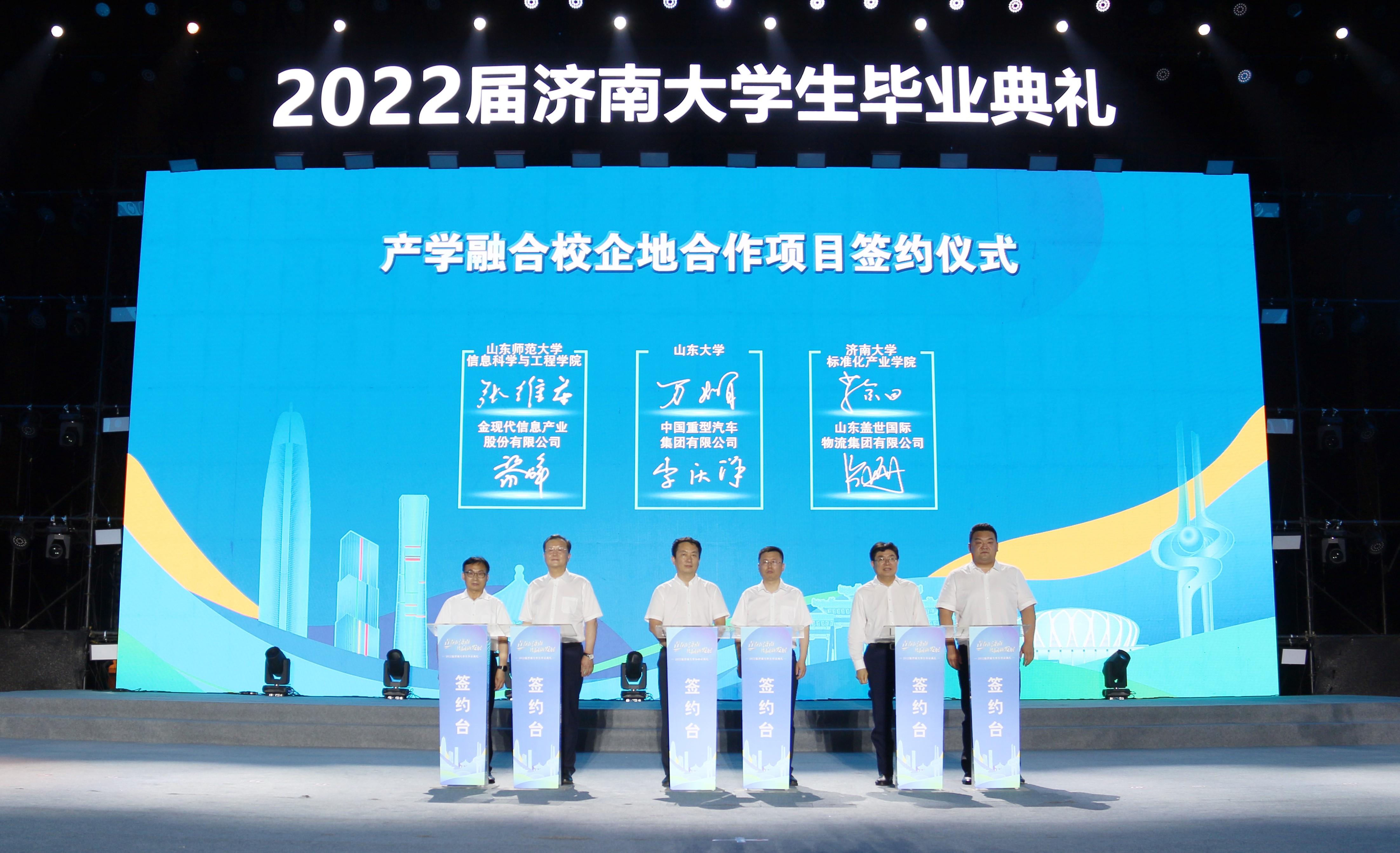 标准化产业金沙国际娱乐城 院长葛金田应邀出席毕业典礼,并在“黄河流域高质量发展校企地青年创新平台项目签约”环节,代表金沙国际娱乐城 与山东盖世国际物流集团进行产学融合校企地合作项目签约。