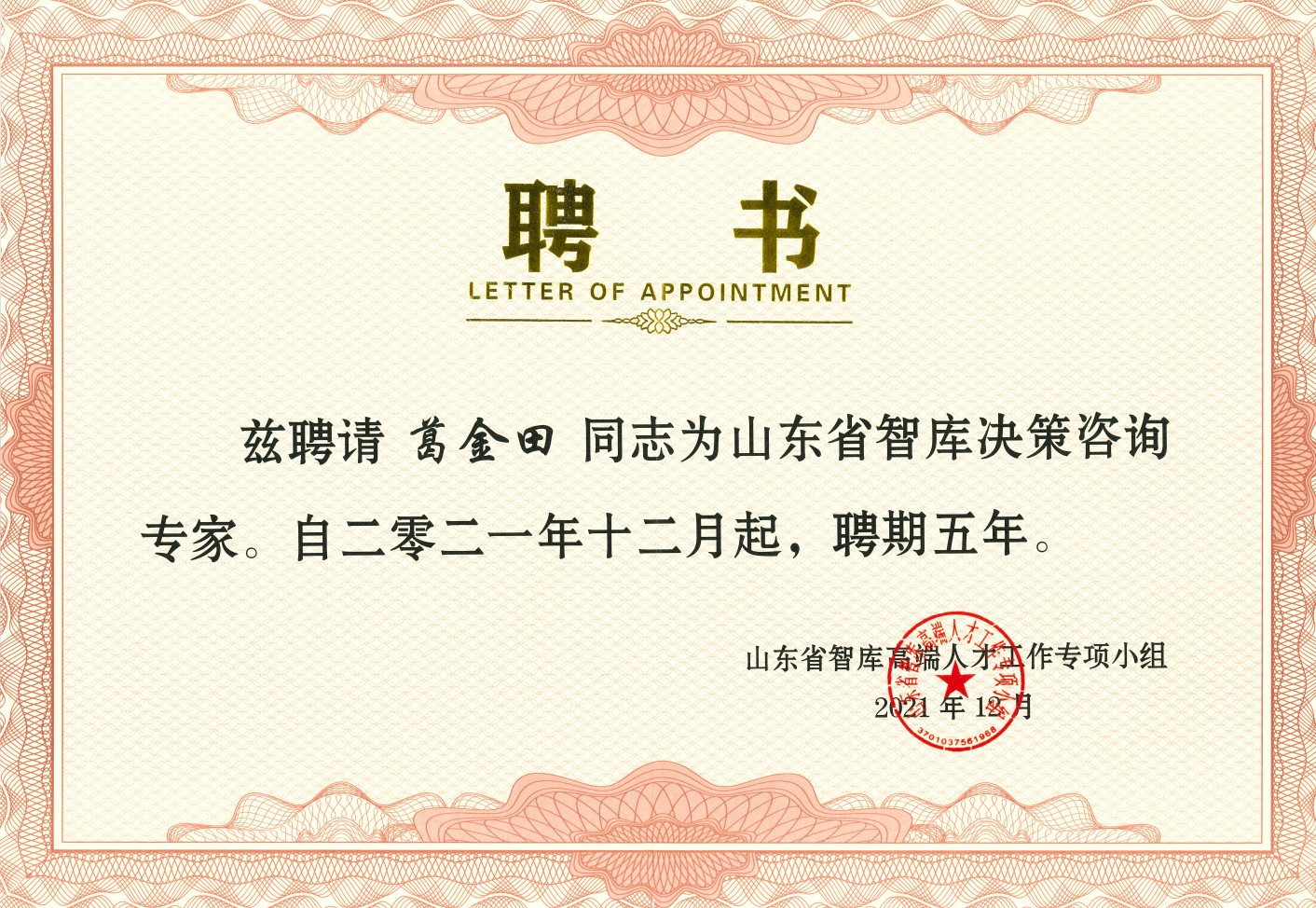 近日,接山东省智库高端人才工作专项小组办公室通知,标准化产业金沙国际娱乐城 院长葛金田教授被续聘为山东省智库决策咨询专家,聘期自2021年12月算起,为期五年。