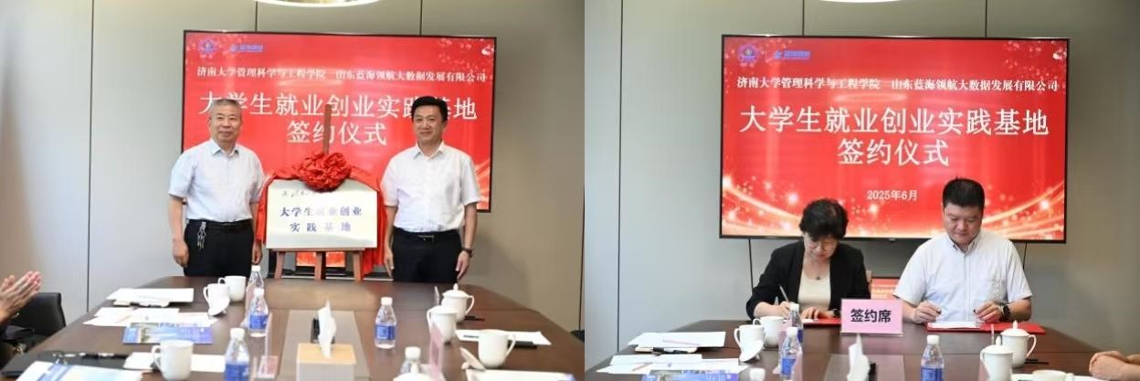 签约仪式上,徐伟与田青共同签署《济南大学大学生就业创业实践基地协议》,徐征和与李经国共同为实践基地揭牌。