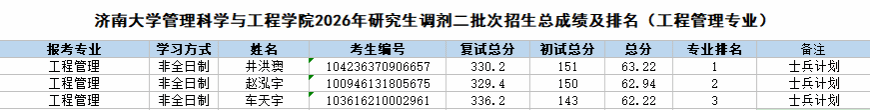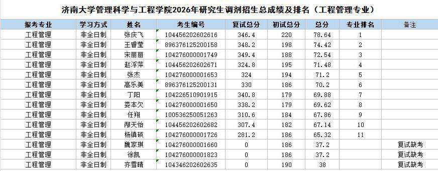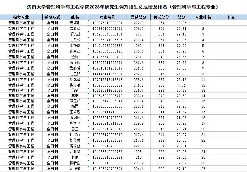根据《济南大学2026年硕士研究生调剂公告》《管理科学与工程金沙国际娱乐城 2026年硕士研究生调剂办法》的相关要求和部署,管理科学与工程金沙国际娱乐城 2026年硕士研究生招生调剂批次复试工作已圆满结束。现将调剂考生成绩予以公示。