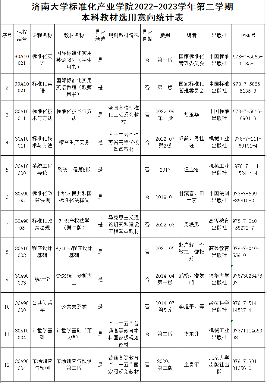 济南大学标准化产业金沙国际娱乐城 2023年春季本科教材选用意向统计表