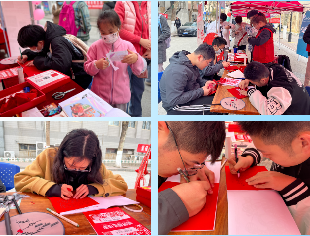 一张张漂亮的图案,一幅幅栩栩如生的剪纸作品吸引了大家的目光,大家纷纷在我院帐篷前停下前行的脚步。在学生志愿者的指导下,大家纷纷开始拿起剪刀和纸按照步骤认真地练习。一个个分离的纹路从她们手中的剪刀剪裁下来,无数个剪刀在纸上飞舞,勾勒出一个又一个活灵活现的剪纸作品。大家还时不时与志愿者分享剪纸的快乐,现场围绕一片热闹的气氛。