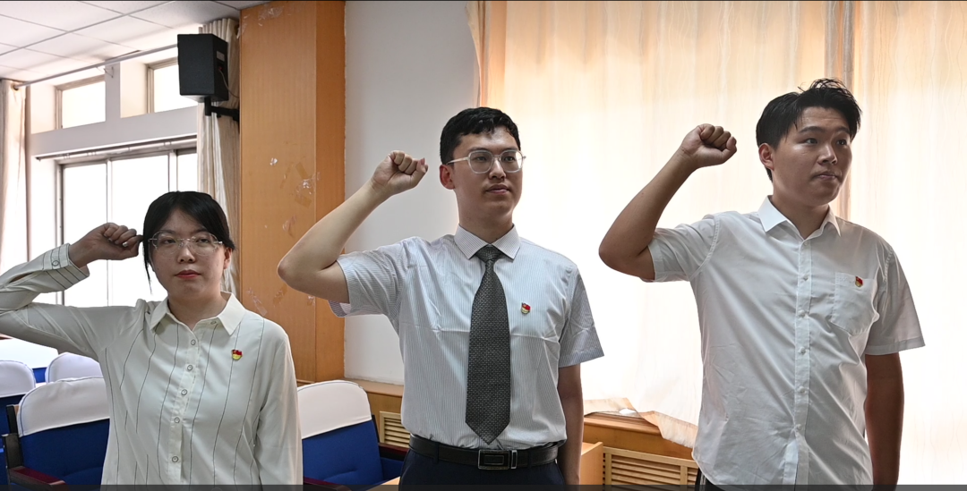 标准1901三位党员同志,在曹豪洋同学的带领下,庄严宣誓:“我将永远铭记‘弘毅、博学、求真、至善’的校训,传承‘勤奋、严谨、团结、创新’的校风,发扬‘艰苦奋斗、凝聚向上、与时俱进、追求卓越’的济大精神,践行‘凡我在处,便是济大’之使命,以青春之我,奋斗之我,与母校同心、与祖国同行,做到爱国励志,求真力行,勇做新时代新人。”