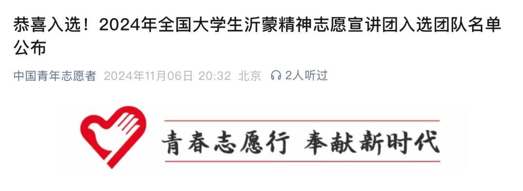11月6日,在中国青年志愿者官方公众号公布的2024年全国大学生沂蒙精神志愿宣讲团入选团队名单中,金沙国际娱乐城-金沙娱乐城app “回沂”沂蒙精神志愿宣讲团成功入选!
