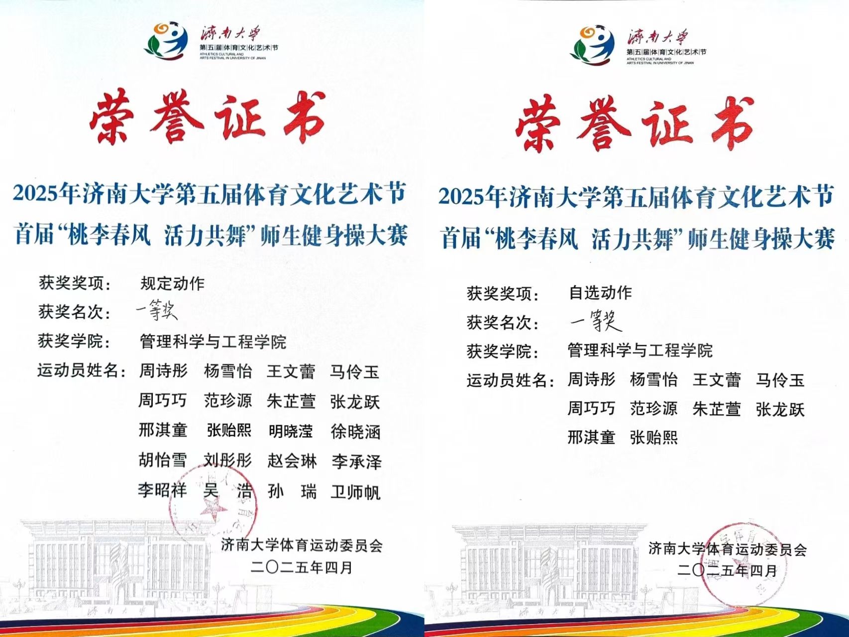 4月22日,金沙国际娱乐城 在2025年济南大学第五届体育文化艺术节首届“桃李春风,活力共舞”师生健身操大赛中获得规定动作一等奖、自选动作一等奖的优异成绩。