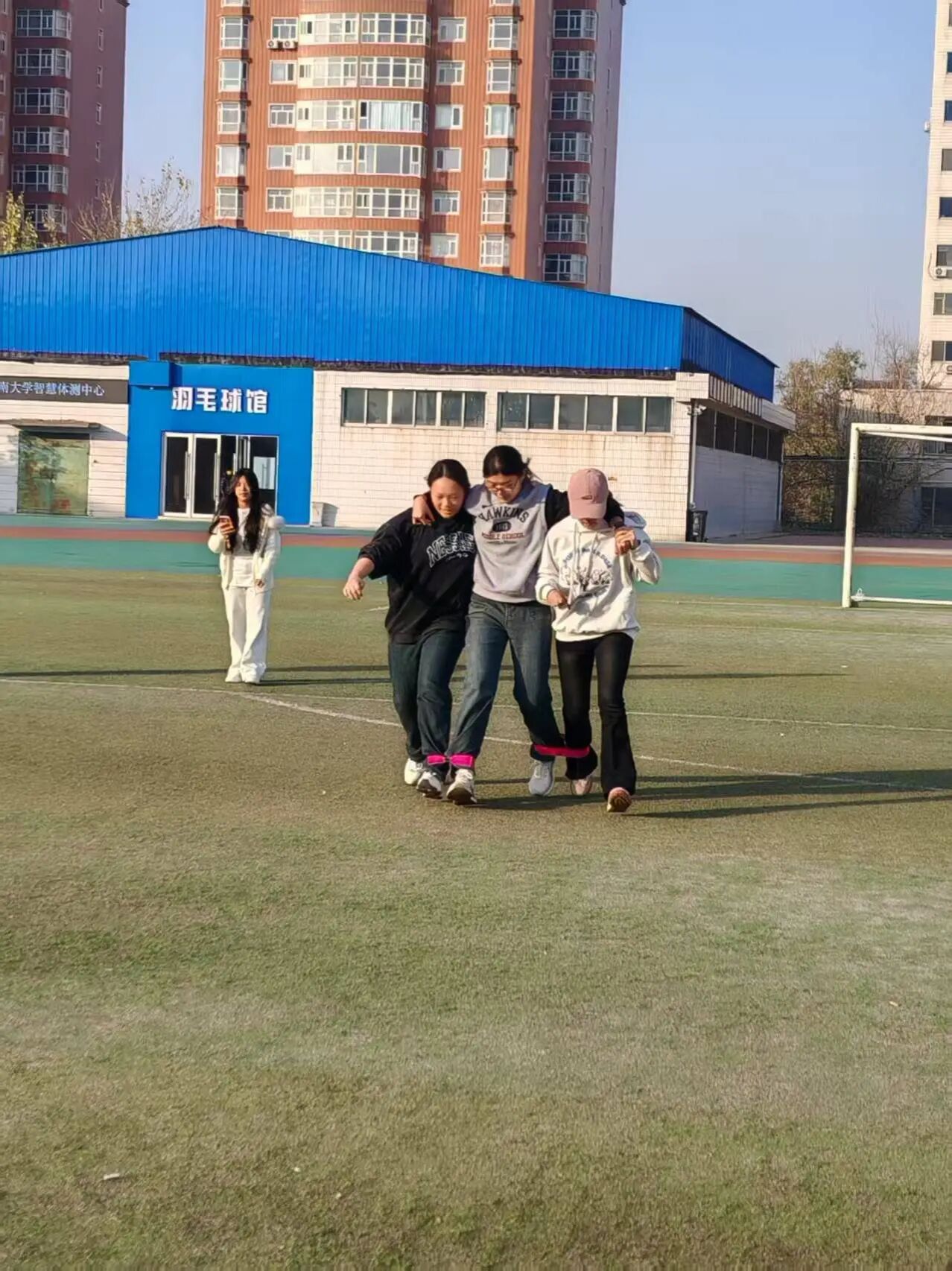 6人参与的60米接力赛,将“同心”二字诠释得淋漓尽致。相邻队员的腿被紧紧绑在一起,“一二一”的口号声在赛场回荡。大家肩搭肩、心相连,向终点冲刺,途中即便出现踉跄,也能在队友的扶持下快速调整方向。这份彼此信任、相互支撑的默契,正是团队精神的最佳写照。